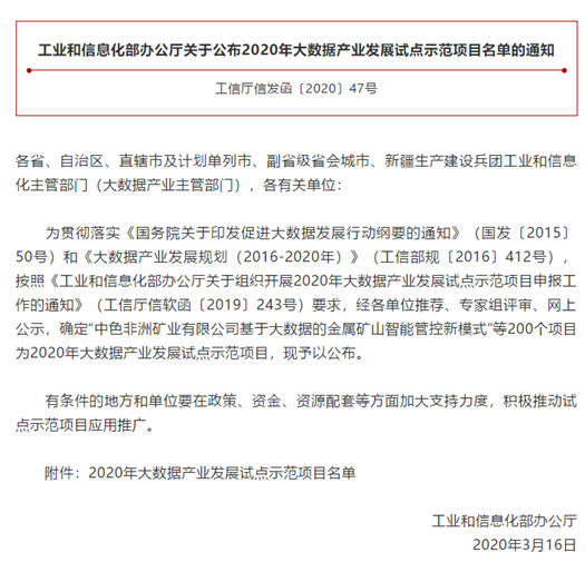 國家工信部此次項目征集,圍繞工業大數據融合應用、民生大數據創新應用、大數據關鍵技術先導應用、大數據管理能力提升4大類7個細分方向,遴選一批大數據產業發展試點示范項目。旨在促進大數據產業創新發展,推動大數據與實體經濟深度融合,通過試點先行、示范引領,總結推廣可復制的經驗、做法,推動大數據在工業企業的研發設計、生產制造、經營管理、銷售服務等全流程融合應用,提高生產效率并降低生產成本,培育數據驅動的工業發展新模式。